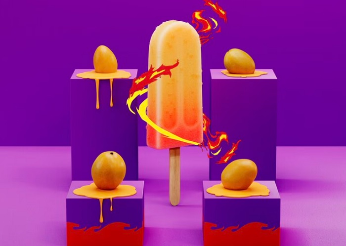 Ahora sí, lo interesante comienza cuando la paleta entra en escena. Su dulzor helado con sabor a mango se mezcla con el fuego de las botanas en cada interacción. No es solo un snack, es un juego sensorial: un contraste que enciende el paladar, baja con dulzor y vuelve a explotar.