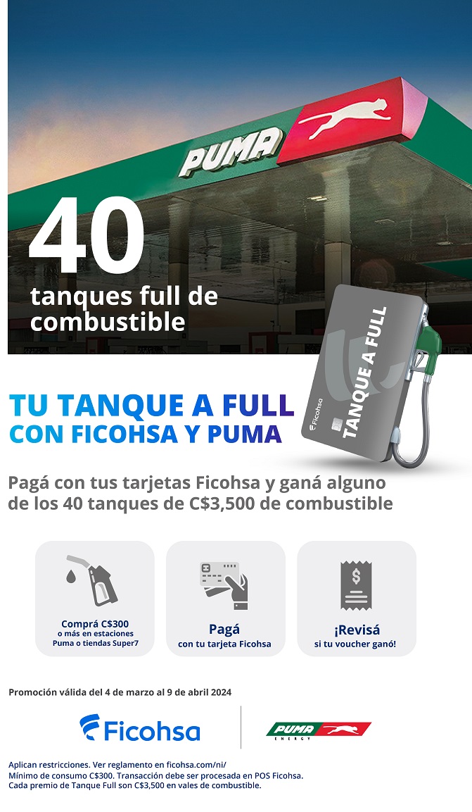 ¿Cómo participar? Simple, del 4 de marzo al 9 de abril, cada vez que realices compras por C$ 300.00 o más en combustible en nuestras estaciones PUMA o en nuestras tiendas Super7 y pagues con tu tarjeta de crédito o débito Ficohsa, automáticamente estarás participando para ganar uno de los 40 tanques de combustible valorados en C$ 3,500.00 cada uno.