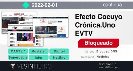 Desde la madrugada del 1 de febrero fue bloqueado el acceso a tres medios digitales: Efecto Cocuyo, Crónica Uno y EVTV Miami, este último con sede en Florida, Estados Unidos. La acción, ejecutada por las empresas de telecomunicaciones CANTV (estatal) y Movistar, Digitel, Supercable e Inter (privadas), operadoras de servicios móviles y de internet, habría respondido a órdenes de la oficialista Comisión Nacional de Telecomunicaciones (Conatel).
