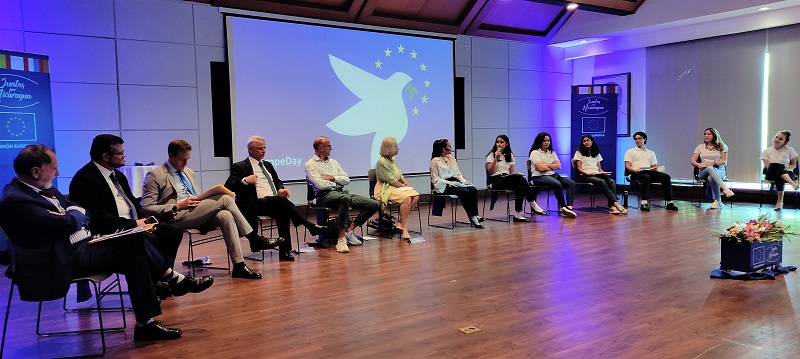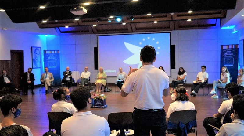 Durante el encuentro, estudiantes y diplomáticos intercambiaron puntos de vista sobre los valores de la paz, la igualdad, la solidaridad, la libertad, la democracia y los derechos humanos en Europa y el contexto mundial. “La juventud juega un papel clave en cada uno de estos ámbitos, prioritarios para la Unión Europea dentro y fuera de nuestras fronteras. Dar voz y protagonismo a los jóvenes, conocer sus principales problemas y anhelos, sus ideas y propuestas, lo que piensan sobre nuestro trabajo, es fundamental para mejorar nuestras acciones en todo el mundo y tener una idea más aterrizada de sus necesidades reales”, expresaron los representantes de la UE y las embajadas de sus Estados Miembros.