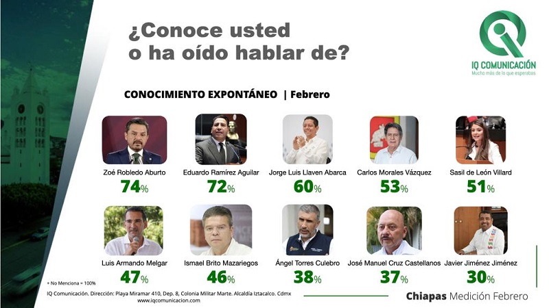 El director de IQ Comunicación, Efraín Delgadillo, destacó que, de manera abierta, entre la ciudadanía chiapaneca hay 3 personajes que obtuvieron el mayor conocimiento espontáneo: Zoé Robledo con 74%, Eduardo Ramírez, con 72%, y Jorge Luis Llaven Abarca, con 60%.